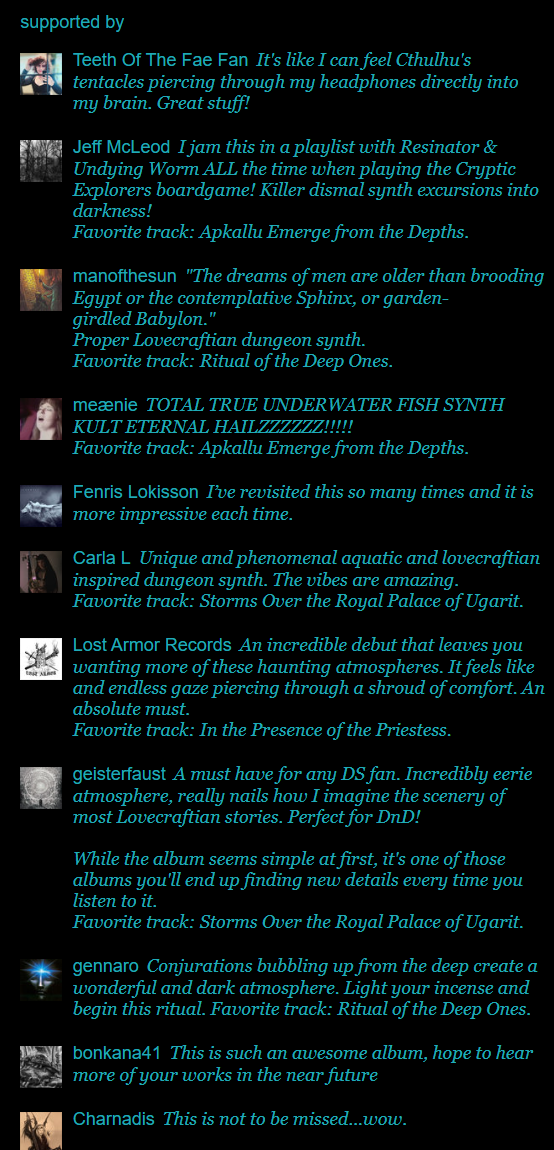 My album release under Disciple of Dagon, Cryptic Dissipation of Ugarit is a polishing and continuation of the work from Demo. I spent a lot more time on this one, refining what worked from my initial release. The cover art is designed using the character Uxia from the great B movie Dagon. I’m really proud of this release and love what I created as a kind of Mesopotamian and Lovecraftian fusion expressed through dungeon synth / dark ambient music.